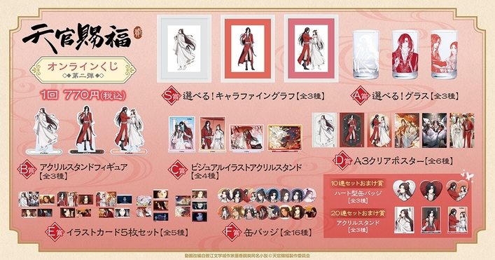 謝憐と花城の描き下ろしイラストを使用した美麗なイラストが楽しめる賞品や、作中のシーンを集めた賞品などファン必携のアイテムが盛りだくさんです。